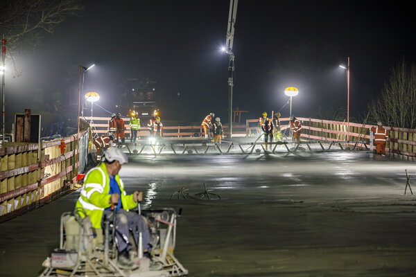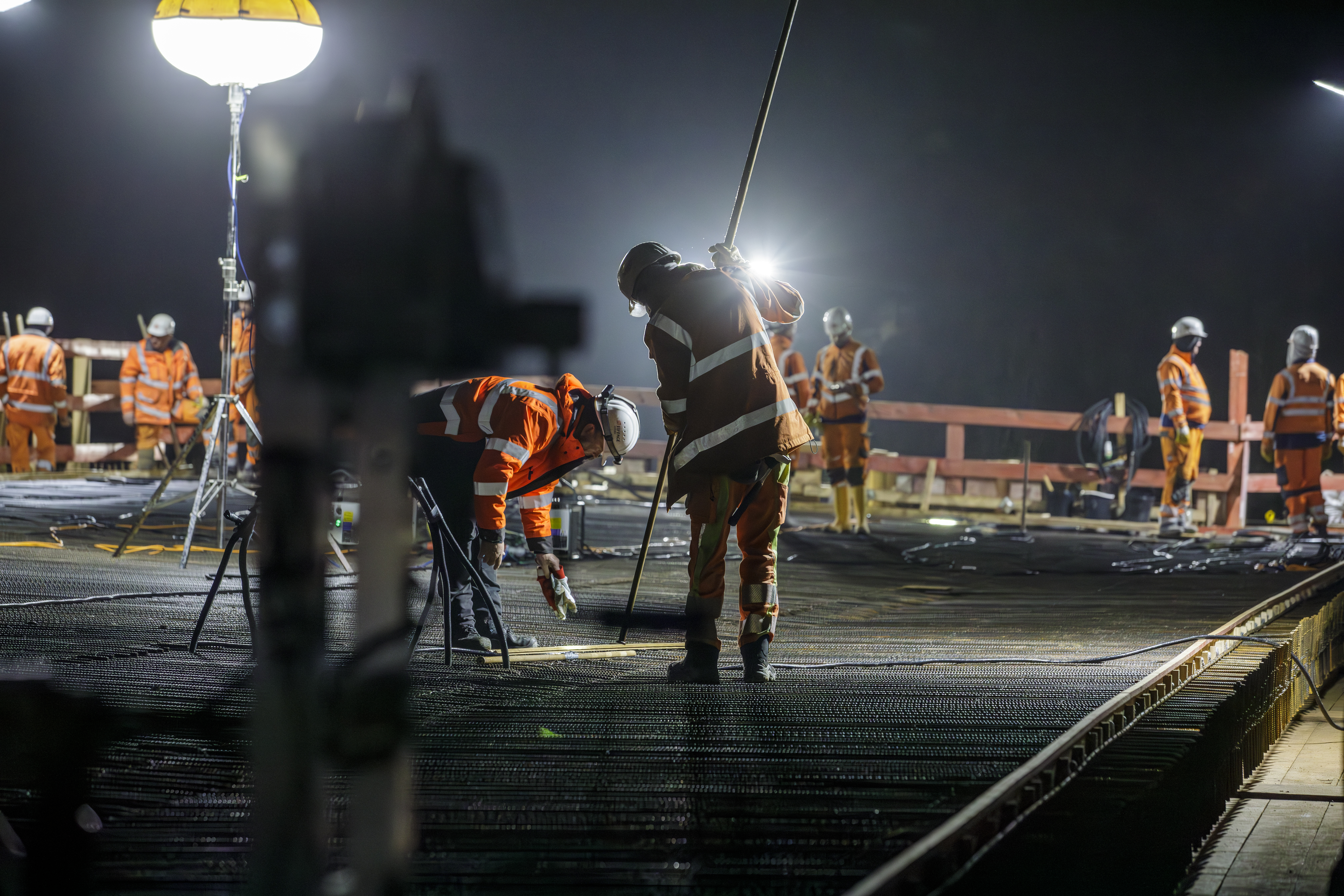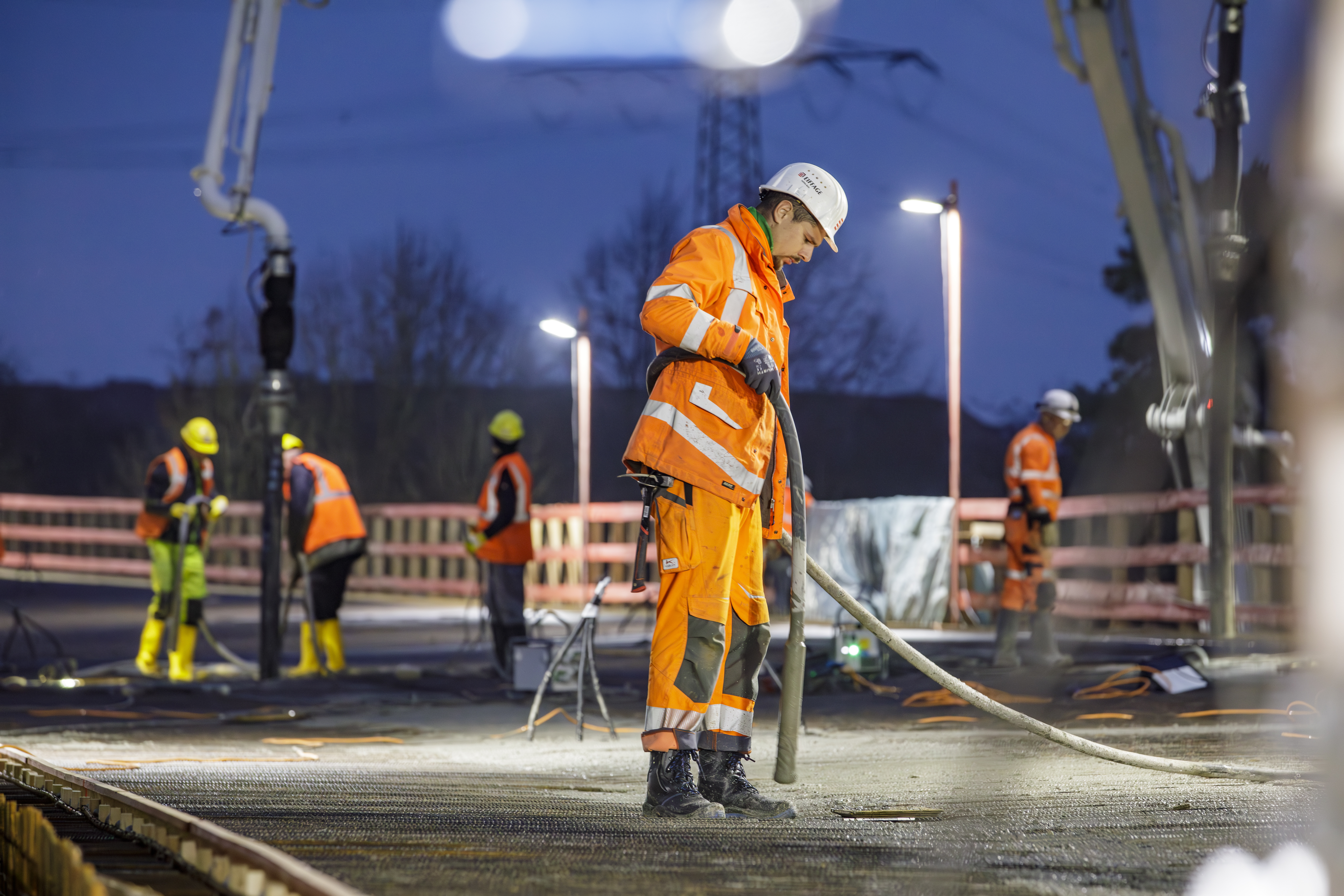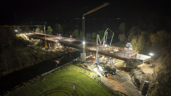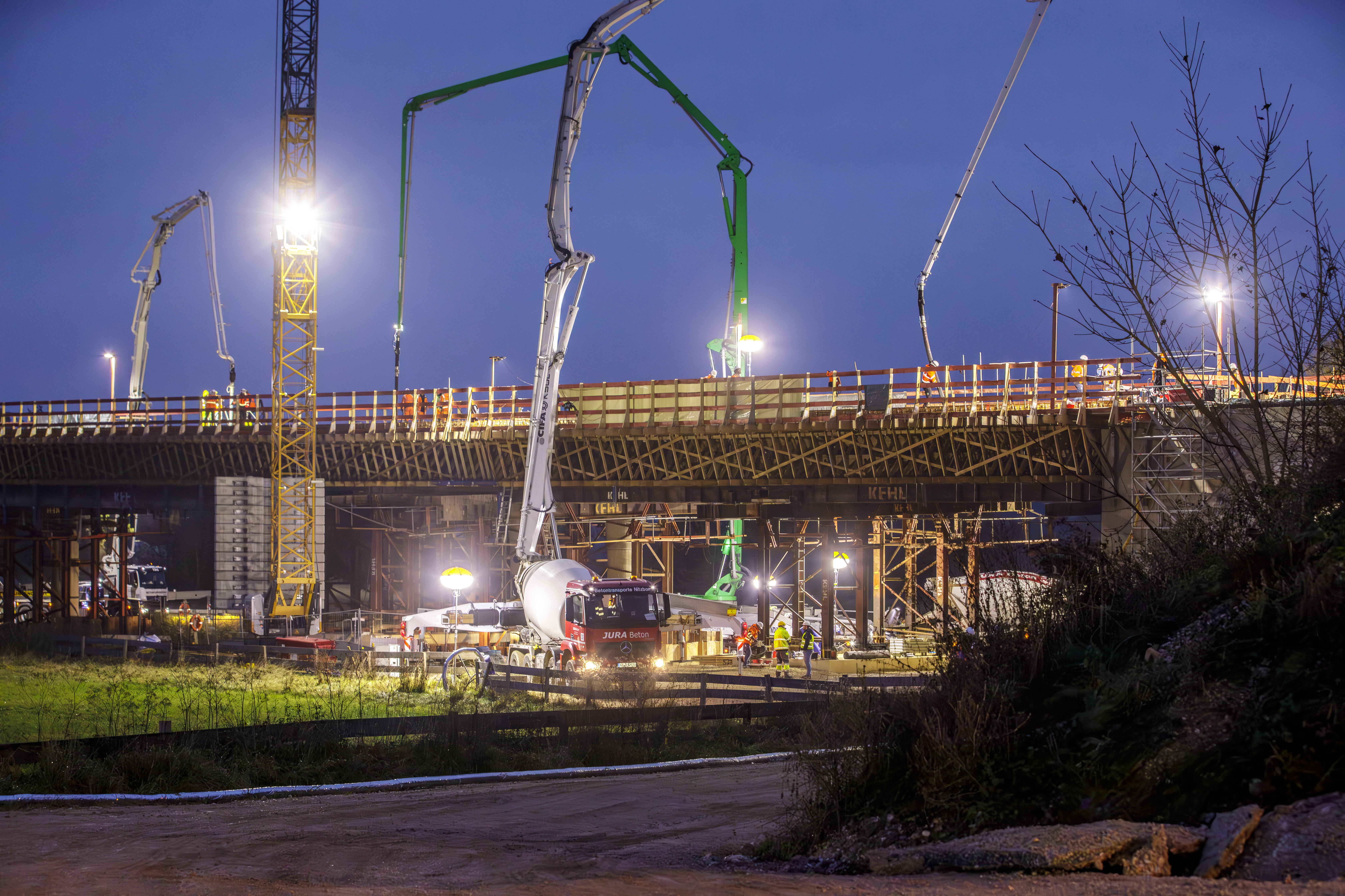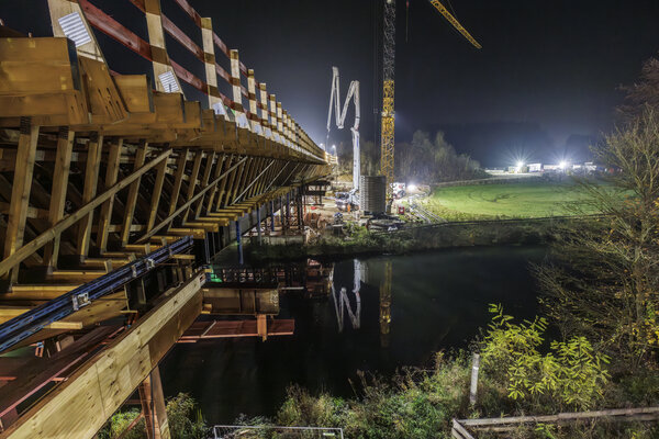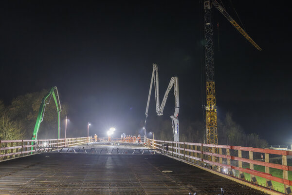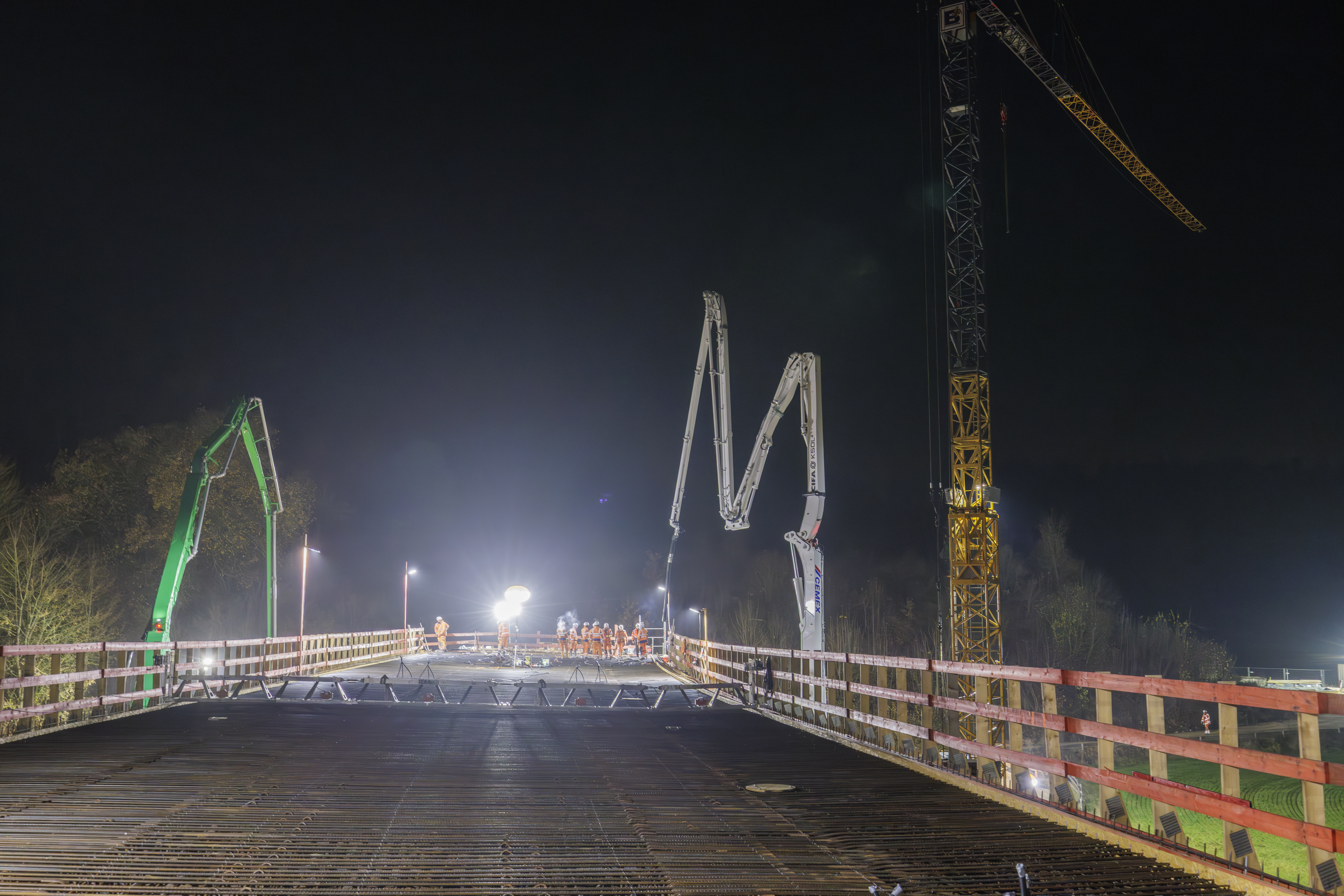 In mehreren Schichten erlebte unser Projektteam alles, was das Brückenbau-Herz höher schlagen lässt. Vom Start um 3 Uhr in der Nacht bis in die späten Abendstunden um 23 Uhr wurde der knapp 135 Meter lange Überbau für die größte Brücke der Kümmersbrucker Westumgehung hergestellt👏.