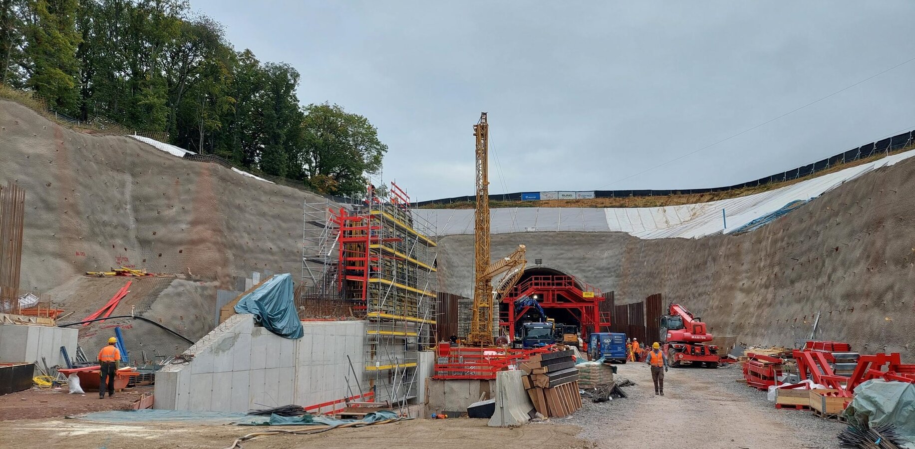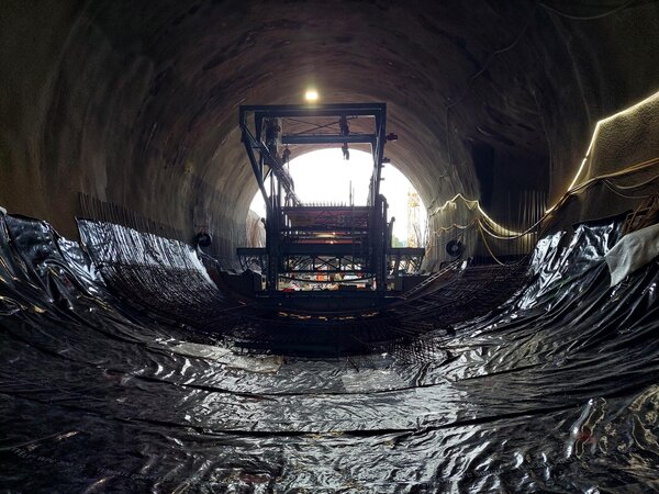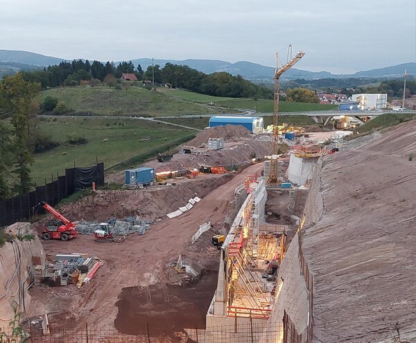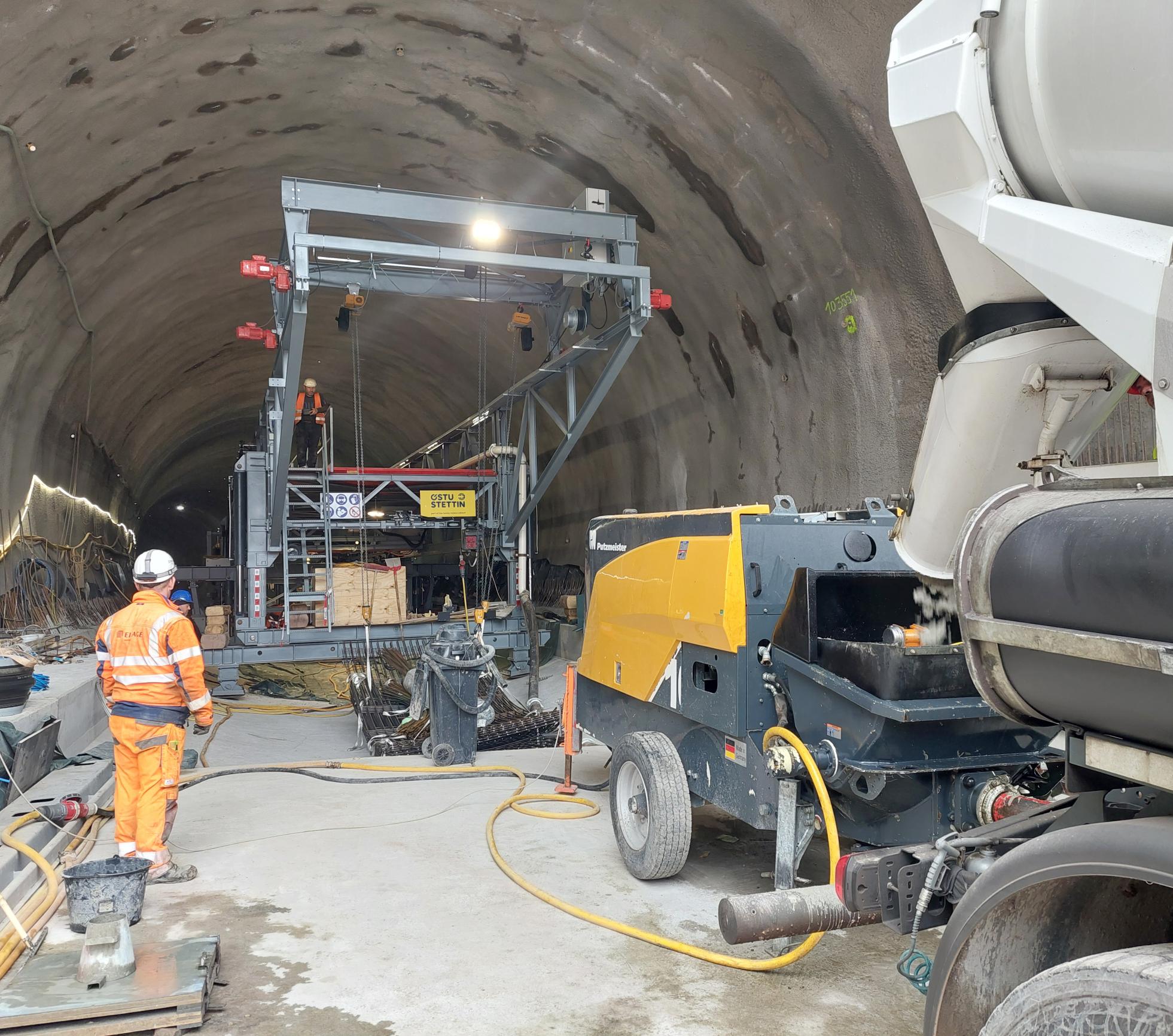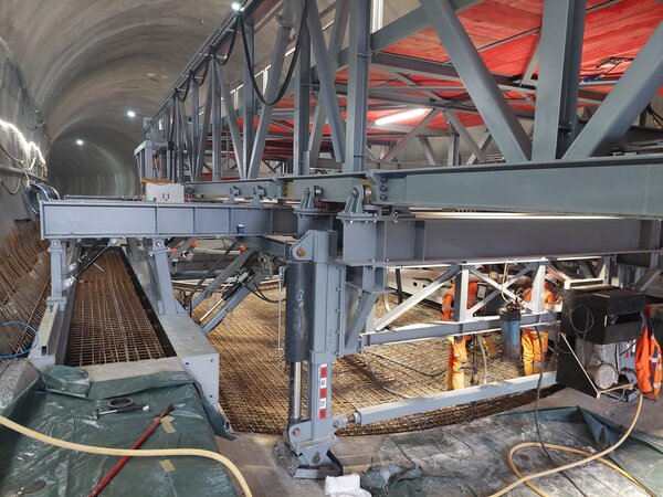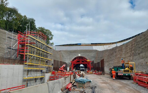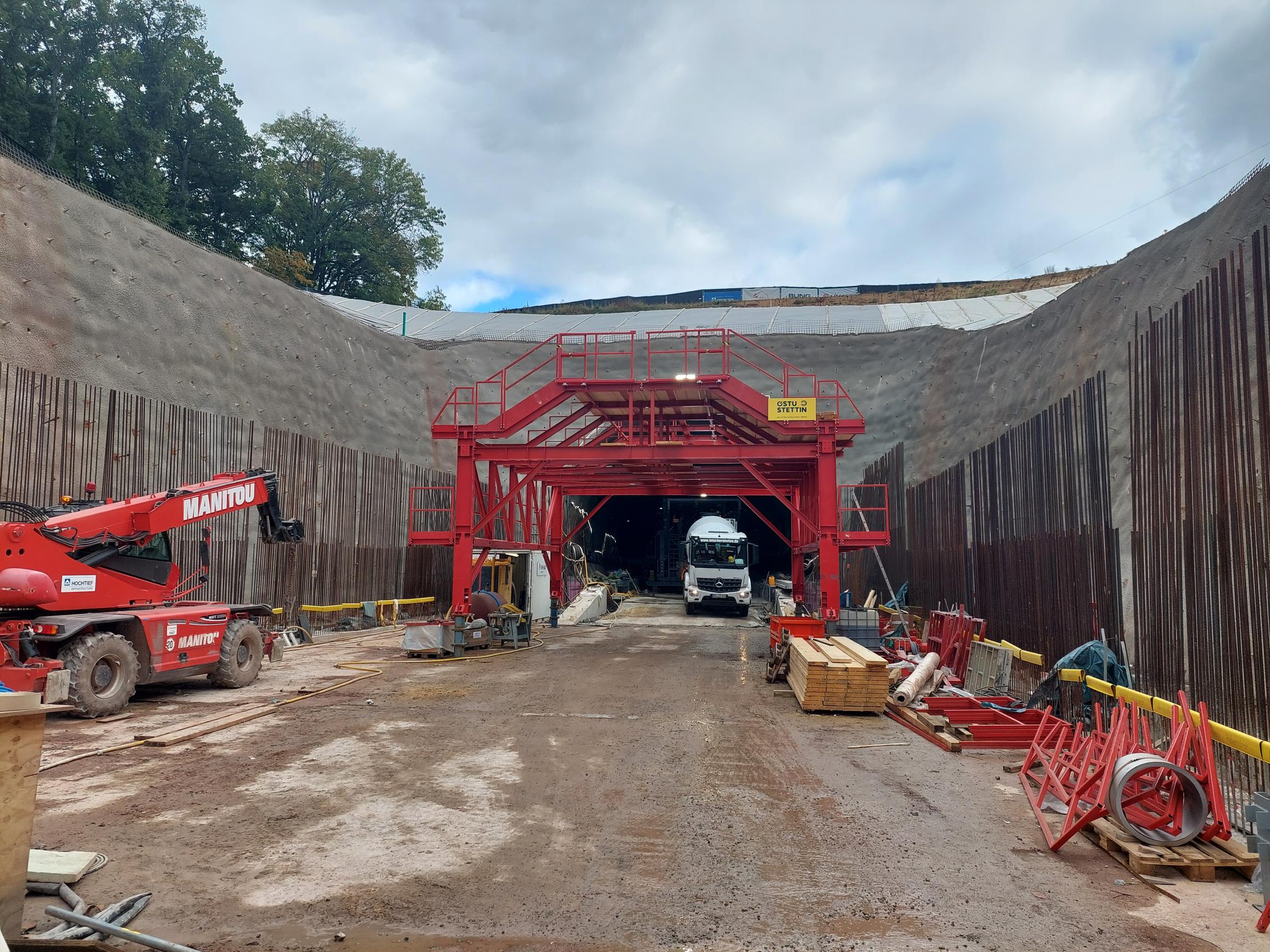 Aktuell nehmen die Ingenieurbauarbeiten an den Vorfeldern Nord und Süd vom Tunnel Berkersklamm immer weiter Formen an, denn die Stützwände sind schon deutlich zu erkennen. Und im Inneren des Tunnels kommt der Schalwagen zur Herstellung der Tunnelinnenschale zum Einsatz.