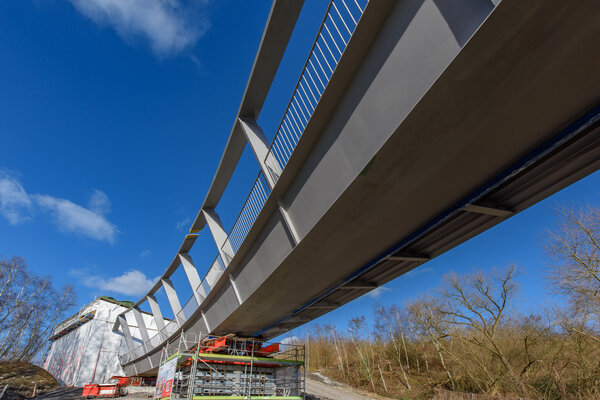 The second cycle path bridge crosses Kamener Straße - another highlight of the project. The 42 m long and 60 tonne structure was successfully lifted into place in May. With a span of 33 metres, the slightly curved steel structure floats elegantly above the road and blends harmoniously into the surrounding landscape.