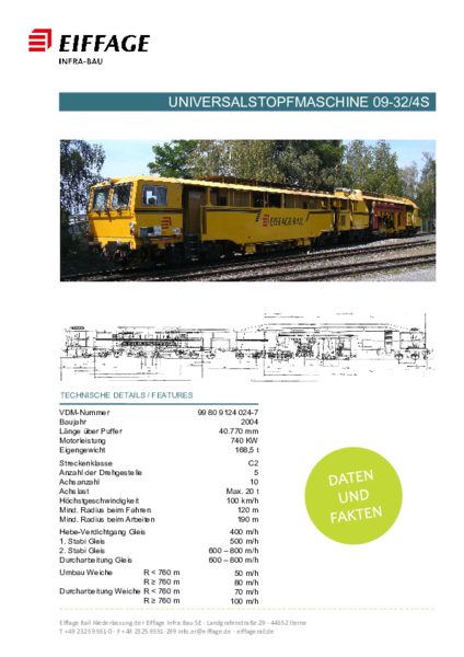 - Arbeitsleistung Durcharbeitung Gleis: Bis zu 800 m/h