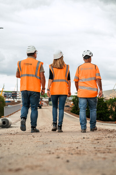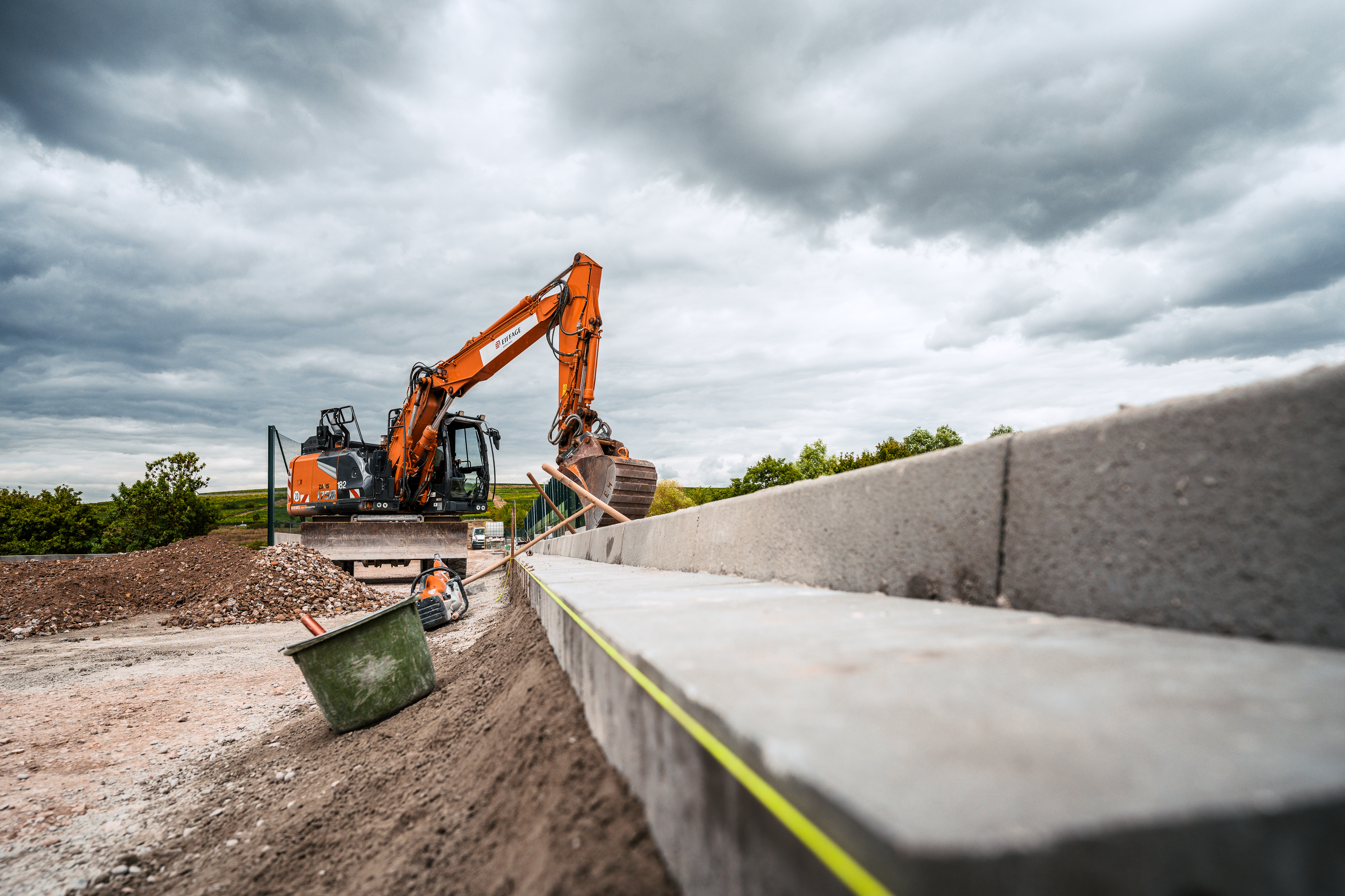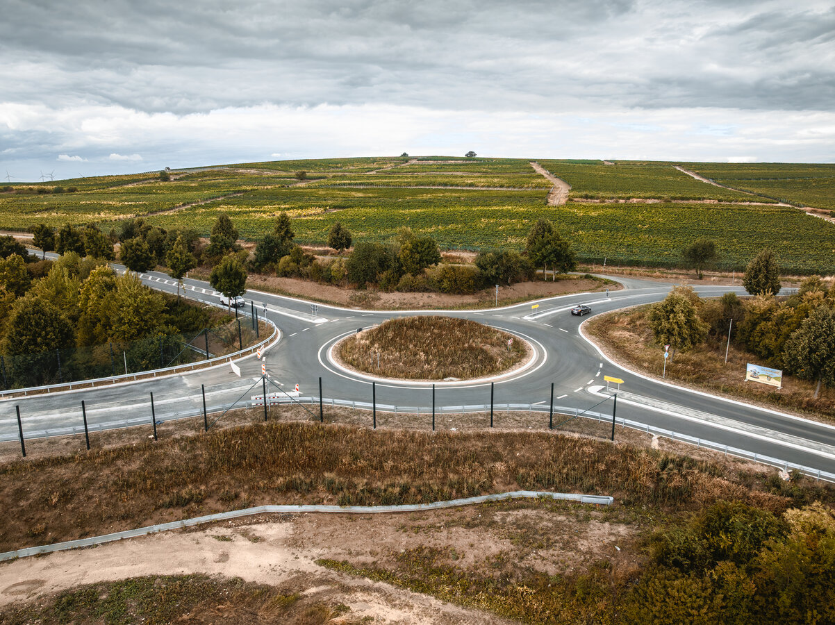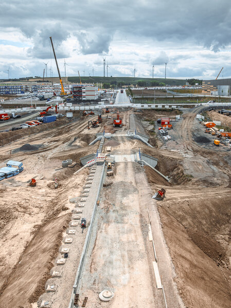 Auf einer Fläche von 80.000 m² bzw. 8 ha sind wir mit voller Energie im Einsatz, um die Infrastruktur fit für neue Unternehmen, den Verkehr und nicht zuletzt für den Artenschutz zu machen. Der Fachbereich Tief- und Straßenbau kümmert sich um die Erschließungsarbeiten – inklusive des Baus eines 3,8 km langen Kanals, über den künftig Schmutz- und Regenwasser getrennt abgeführt werden. Das Regenwasser wird darüber kontrolliert in zwei Rückhaltebecken geleitet. Gleichzeitig werden insgesamt 28 km Versorgungsleitungen für Wasser, Strom und Glasfaser verlegt. Zusätzlich wurde ein neuer Kreisverkehr bei Schafhausen gebaut – eine echte Herausforderung aufgrund zahlreicher unterirdischer Leitungen. Auch Gas- und Entwässerungsleitungen wurden verlegt – mit einem Auge stets auf den Artenschutz und dem anderen auf möglichst geringe Verkehrsbeeinträchtigungen.