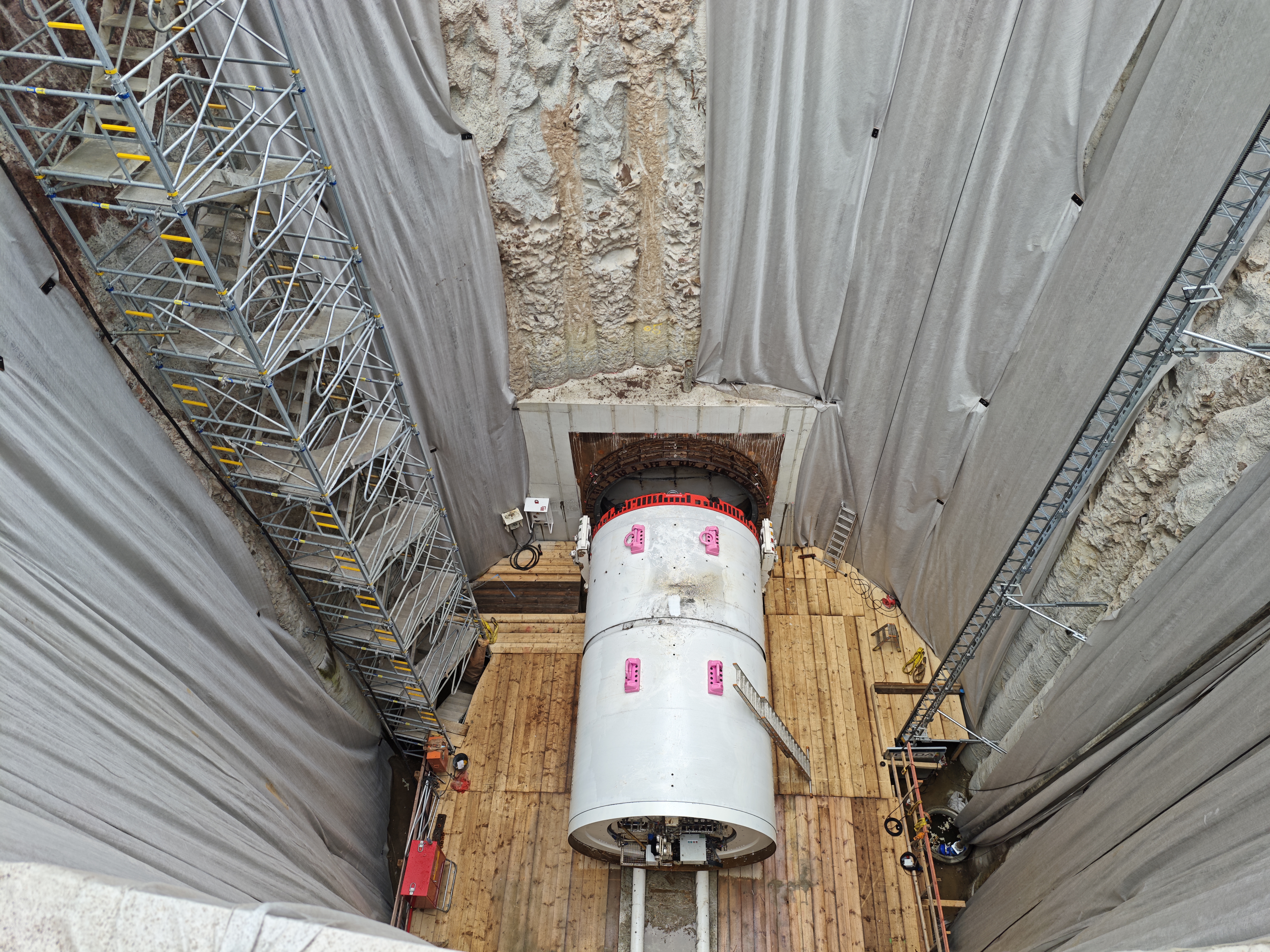 • Tunnelvortrieb Einsatz einer Mikrotunnelmaschine (AVND2400) mit einem Schneidrad-Durchmesser von ca. 4 m. Die Maschine wird im Juli 2025 in die Startbaugrube eingebracht.